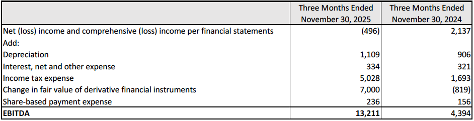 The following table provides a reconciliation of net (loss) income and comprehensive (loss) income to EBITDA per the Unaudited Interim Condensed Consolidated Financial Statements for the three months ended November 30, 2025: