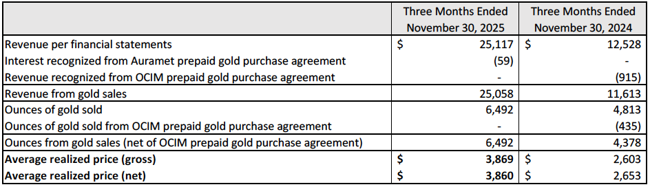 The following table provides a reconciliation of average realized price per ounce of gold sold to revenue per the Unaudited Interim Condensed Consolidated Financial Statements for the three months ended November 30, 2025:
