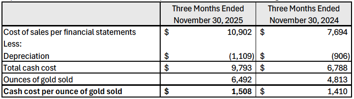 Cash cost per ounce of gold sold is a non-IFRS performance measure and does not constitute a measure recognized by IFRS and does not have a standardized meaning defined by IFRS. Cash cost per ounce may not be comparable to information in other gold producers’ reports and filings. The following table provides a reconciliation of total cash cost per ounce of gold sold to cost of goods sold per the financial statements for the three months ended November 30, 2025: