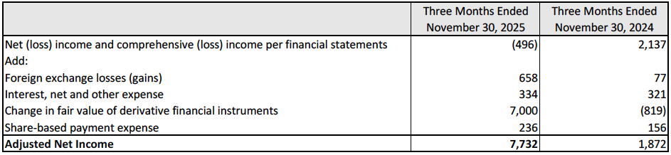 The following table provides a reconciliation of net (loss) income and comprehensive (loss) income to Adjusted Net Income per the financial statements for the three months ended November 30, 2025: