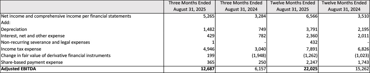 The following table provides a reconciliation of net income and comprehensive income to Adjusted EBITDA per the financial statements for the three and twelve months ended August 31, 2025.