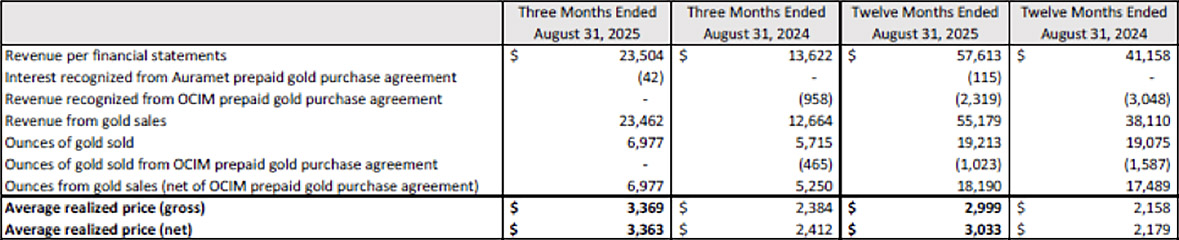 - Record Revenue, Profitability and Cash Generation: During Q4 2025, the Company poured a record 6,404 ounces of gold (Q4 2024: 5,767 ounces) and sold 6,977 (Q4 2024: 5,715) ounces of gold at an record average realized price (net)1 of $3,363 per ounce (Q4 2023: $2,412 per ounce), recognizing revenue of $23.5 million, gross profit of $12.6 million, net income of $5.3 million, operating cash flow of $8.5 million and Adjusted EBITDA1 of $12.7 million, all of which reflect increases compared to the prior year comparative period. For the year ended August 31, 2025, the Company poured 18,935 ounces of gold (2024: 19,389 ounces) and sold 19,213 ounces of gold (2024: 19,075 ounces) at a full year record average realized price (net)1 of $3,033 per ounce, recognizing record revenue of $57.6 million, gross profit of $23.9 million, net income of $6.6 million, operating cash flow of $16.3 million and Adjusted EBITDA1 of $22.0 million, all of which reflect increases compared to the prior year comparative period.